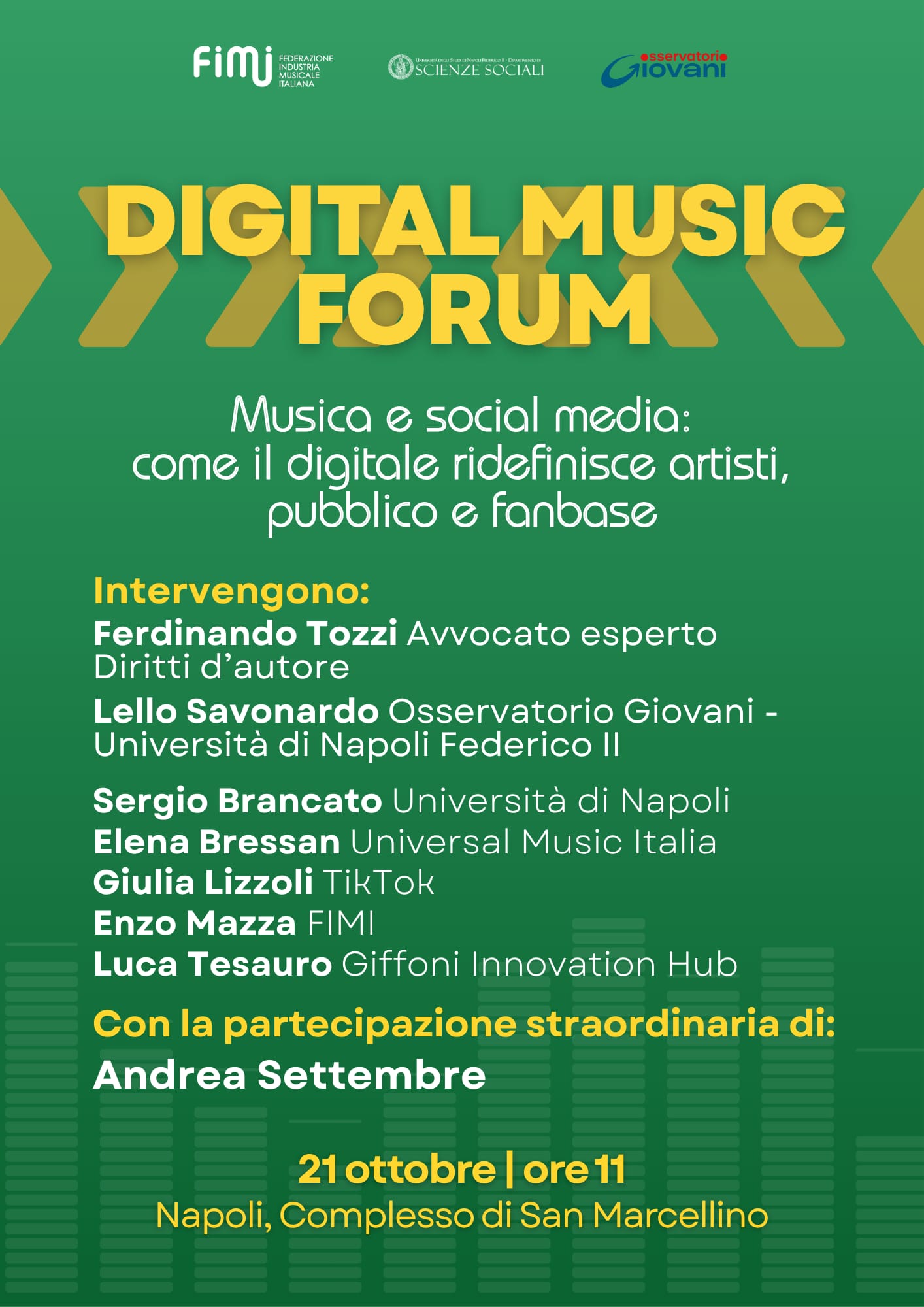 Dai palchi di Sanremo alle fanbase nate online, oggi la musica vive e cresce nei social e il digitale ridefinisce artisti e pubblico. È il tema della nuova edizione del Digital Music Forum, l’appuntamento promosso da Federazione industria musicale italiana, con il patrocinio del Comune di Napolie la collaborazione dell’Osservatorio giovani della Federico II. Il progetto Generazione Creativa, promosso dal Dipartimento di Scienze sociali, ogni anno porta a confronto istituzioni, artisti, accademici e professionisti del settore sui temi digitali più rilevanti per l’industria musicale. L’edizione 2025 si terrà il 21 ottobre e sarà ospitata nel Complesso dei Santi Marcellino e Festo dell’Università Federico II, confermando la sinergia con uno dei principali luoghi di dialogo con le nuove generazioni. Dopo aver esplorato negli anni passati l’impatto dell’intelligenza artificiale, il Forum torna infatti a concentrarsi sui social media, con un focus su come il digitale abbia trasformato la relazione tra gli artisti e la sfera pubblica, dando vita al fenomeno dei superfan e a nuove forme di interazione tra pubblico e creatività. L’evento vedrà anche quest’anno la partecipazione di voci istituzionali e accademiche insieme a protagonisti dell’industria musicale e del mondo digitale: dal Ceo Fimi Enzo Mazza, che offrirà uno scenario di mercato con focus sull’impatto del digitale nel settore musicale, a Elena Bressan, Social media & influencer marketing coordinator Universal Music Italia, che racconterà le strategie di comunicazione social di artisti e label nello scenario postpandemico, passando per Giulia Lizzoli, Head of Music Operations SEU di TikTok, con un’analisi sul ruolo della creatività degli utenti e dei contenuti virali nel generare e consolidare fanbase, ridefinendo le strategie di lancio e comunicazione per gli artisti. Prosegue inoltre la proficua collaborazione con il Giffoni Innovation Hub, per il quale sarà presente il CEO Luca Tesauro, che offrirà un focus sulle nuove forme del linguaggio digitale e sul loro impatto nella relazione tra musica e Gen Z, mentre il docente ordinario di Sociologia dei processi culturali e comunicativi Sergio Brancato approfondirà il fandom come fenomeno culturale e sociale e Ferdinando Tozzi, esperto diritti di autore e consigliere delegato del sindaco di Napoli su industria musica e audiovisivo, effettuerà un’analisi giuridica dello scenario. Tra i momenti salienti, “I linguaggi della creatività”, conversazione con Andrea Settembre. Modera: Lello Savonardo, coordinatore dell’Osservatorio Giovani e consulente del sindaco della Città Metropolitana di Napoli per le politiche culturali giovanili