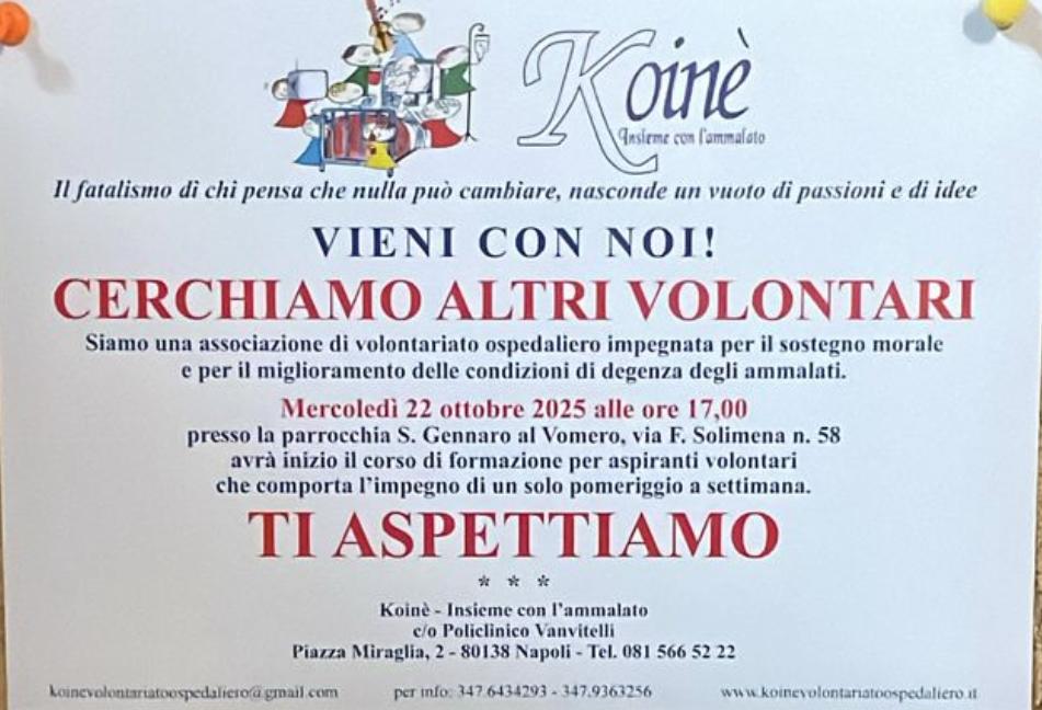 Sensibilizzazione, entusiasmo ed estrema attenzione alle relazioni umane. Sono questi gli elementi che da ben 34 anni, appena compiuti, sottolineano il profilo di Koinè – Insieme con l’ammalato, storica associazione di volontariato ospedaliero presieduta da Maria Paola Garofalo. Proprio per celebrare l’importante traguardo, l’associazione ha scelto di organizzare un convegno speciale, lo scorso settembre, all’ospedale CTO di Napoli. L’evento, organizzato in collaborazione con l’AORN Ospedali dei Colli e con l’Università degli Studi della Campania Luigi Vanvitelli, è stato anche l’occasione per ripercorrere la lunga e intensa storia dell’associazione, che da oltre tre decenni offre sostegno ai pazienti ricoverati nei diversi ospedali della città e accompagna con discrezione e umanità il lavoro del personale sanitario. “Koinè compie 34 anni – sottolinea Maria Paola Garofalo – e abbiamo voluto festeggiare con un appuntamento straordinario, riunendo professionisti e volontari, persone che hanno condiviso con noi una storia fatta di relazioni umane preziose con degenti e operatori sanitari. Un cammino che ci ha arricchito profondamente e che ci incoraggia a continuare con lo stesso entusiasmo di sempre”.