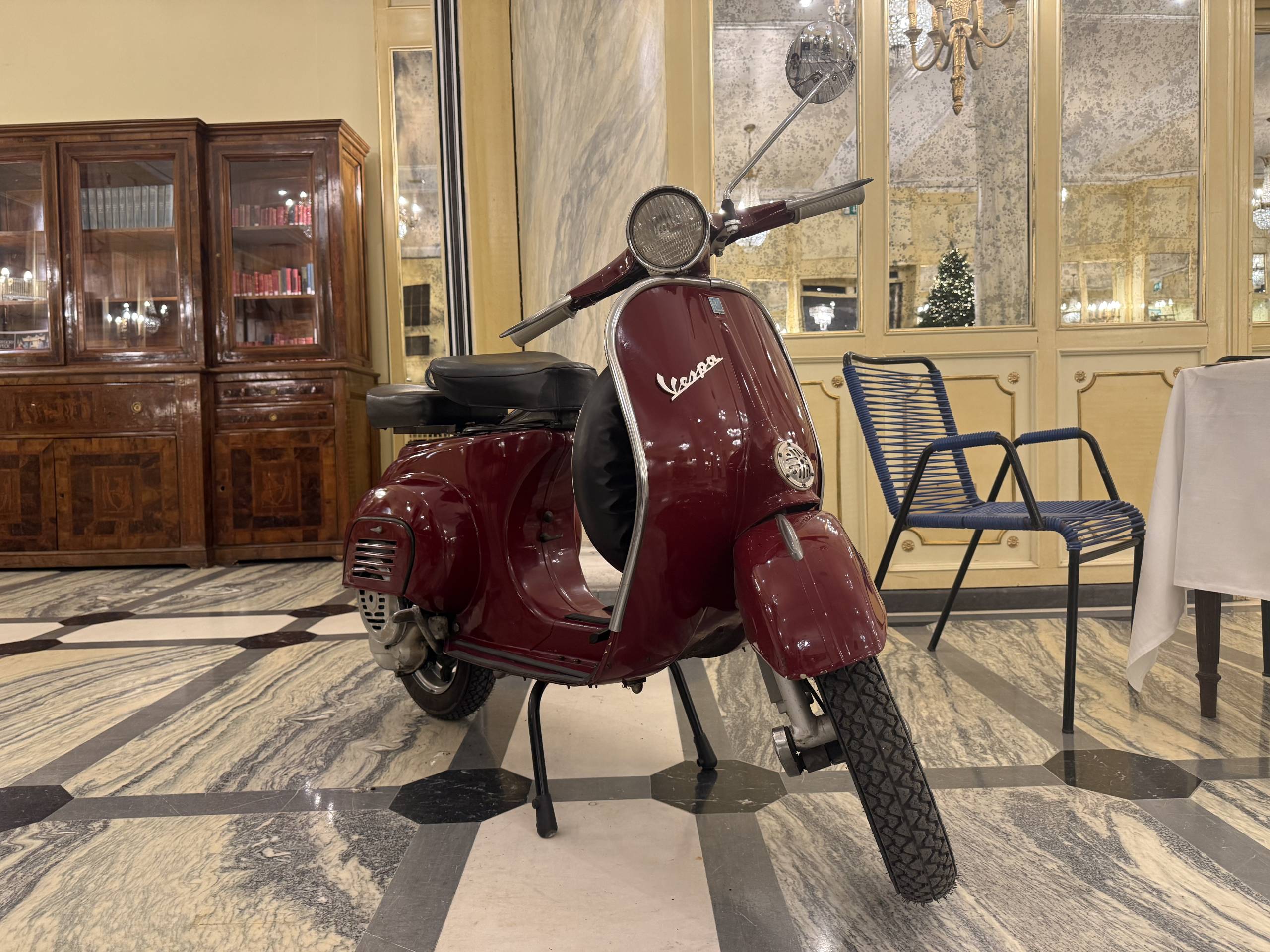Tra gli oggetti esposti figurano il ventilatore da tavolo Zerowatt modello VE505, progettato da Ezio Pirali (Compasso d’Oro 1954), e il celebre telefono Grillo, nato dalla matita visionaria di Marco Zanuso e Richard Sapper nel 1965 (Compasso d’Oro 1967). Accanto a questi capolavori, i visitatori potranno ammirare le macchine da scrivere Olivetti Lettera 22 e Lettera 32, progettate da Marcello Nizzoli, simboli di un’epoca in cui la scrittura era un atto di stile; il telefono Ericofon – noto come “Telefono Cobra” – oggi parte della collezione permanente del MoMa di New York; radio d’epoca come la Europhon RC62 del 1962; i caratteristici “mangiadischi” degli anni Sessanta; e una splendida Vespa Piaggio della prima metà degli anni Sessanta, emblema della libertà e dello spirito italiano. Sono, inoltre, esposti i ritratti di Marcello Mastroianni e Sophia Loren insieme all’opera “La Vespa” (nella foto), simboli dell’Italia del ‘900, firmati dal Maestro Domenico Sepe, scultore, pittore e scenografo. In riconoscimento del profondo legame tra il Maestro e la Famiglia Avallone, Grand Hotel Parker’s gli ha conferito la targa speciale: “Grand Hotel Parker’s per l’Arte”. L’allestimento ricrea l’atmosfera vibrante e sofisticata dell’epoca attraverso “angoli tematici” accuratamente curati: un tavolino in stile Via Veneto con le mitiche sedie Scooby-Doo da bar, complete di bicchieri “da cordiale” in colori vivaci e bordo dorato; una postazione dedicata a Federico Fellini e alla sua rivoluzione cinematografica; e una scenografia con Vespa d’epoca che evoca la spensieratezza e l’eleganza delle vie romane immortalate dal cinema. Completano l’esposizione locandine cinematografiche d’epoca, dischi a 45 giri che hanno fatto ballare l’Italia, riviste che raccontano la società del boom economico, e decine di altri oggetti iconici – da bicchieri in cristallo con finiture dorate a ventilatori San Giorgio, da sveglie Westclox a radio transistor portatili – che testimoniano come, in quegli anni straordinari, anche gli oggetti più semplici fossero concepiti con un’attenzione estetica senza precedenti. La mostra include anche una selezione di autografi originali di icone degli anni ’50 e ’60, la stagione d’oro de La Dolce Vita italiana; tra questi spicca un raro autografo di Gina Lollobrigida, con dedica su una sua fotografia degli anni ’50. Giovanni Torre Avallone, Maître de Maison e Chief Experience Officer commenta: “La Dolce Vita è un patrimonio identitario dell’intero Paese, non solo legata a Roma. Napoli, con la sua musica, la sua arte e la sua straordinaria capacità di trasformare emozioni in bellezza, ne è parte essenziale. È in questa connessione tra arte e identità, che il Grand Hotel Parker’s ritrova il suo legame più autentico con La Dolce Vita”. La mostra è aperta sia ad ospiti che a visitatori, tutti i giorni, fino a venerdì 16 gennaio 2026, nella Sala degli Specchi del Grand Hotel Parker’s.