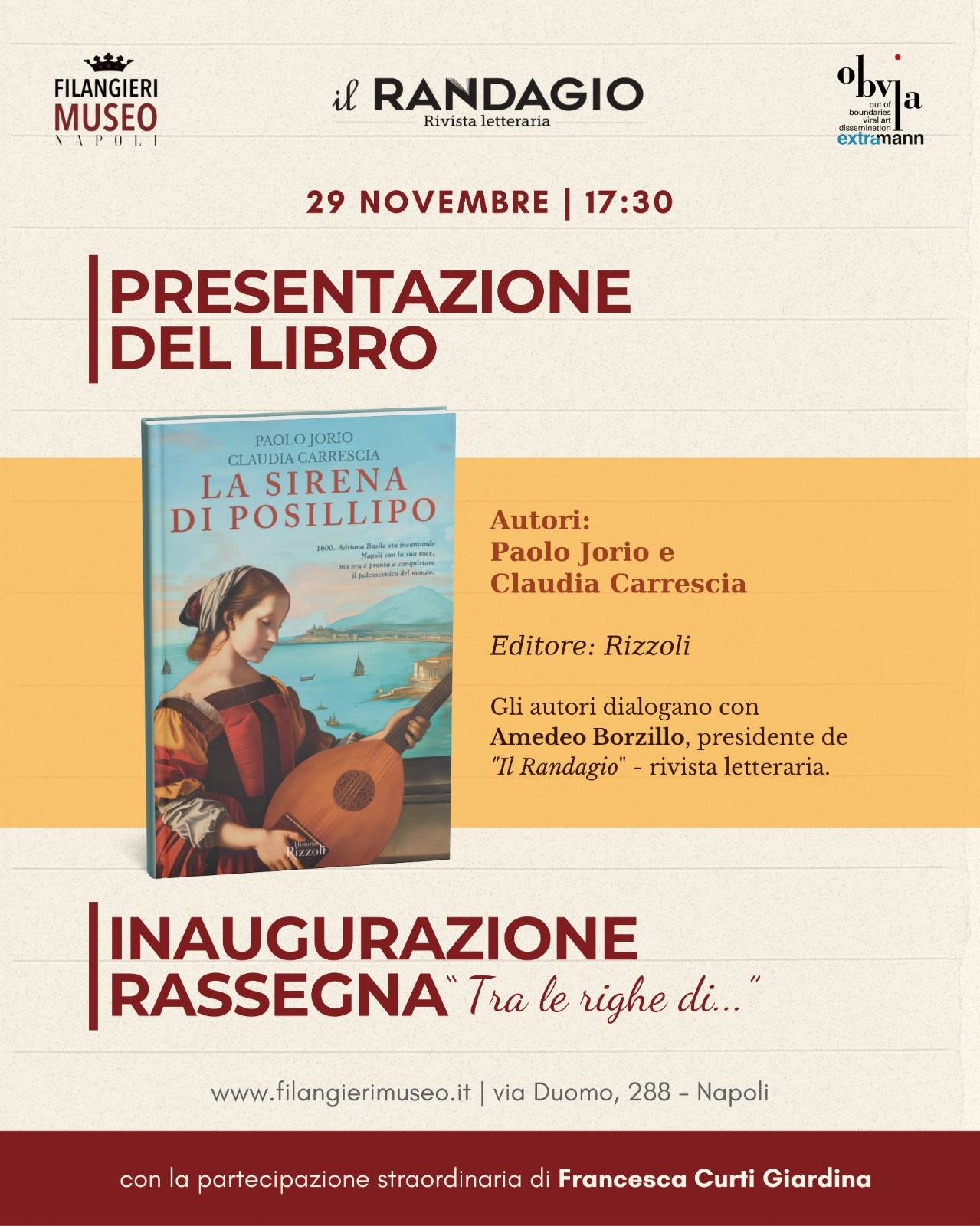Questo pomeriggio alle 17.30, al Museo Filangieri di Napoli, sarà presentato il romanzo storico “La Sirena di Posillipo”, scritto da Paolo Jorio e Claudia Carrescia ed edito da Rizzoli. Nel libro gli autori dialogano con il presidente della rivista letteraria “Il Randagio” Amedeo Borzillo. Un appuntamento che inaugura la Rassegna Letteraria “Tra le righe… ”. È il dicembre 1586, a Posillipo viene alla luce Adriana Basile e il talento è una questione di sangue, per i Basile. Adriana, oltre a una bellezza fuori dal comune, rivela prestissimo una voce capace di ammaliare come il canto di una sirena. Diversamente, l’introverso fratello maggiore Giambattista, passa le giornate con la testa tra le nuvole. La Napoli è quella seicentesca, palcoscenico perfetto per entrambi: Giambo abita il mondo della letteratura e porta il peso di un segreto inconfessabile; Adriana, volitiva e determinata a raggiungere la gloria, cresce diventando la cantante più contesa dai potenti del tempo. Tra un miracolo del sangue di San Gennaro e una gara di canto in occasione della festa di Piedigrotta, succedono eventi tra le corti dei Gonzaga e la Roma dei papi, nei postriboli più sordidi e sulle terrazze più stupende di Napoli. Il resto vale la pena leggerlo direttamente nel libro.