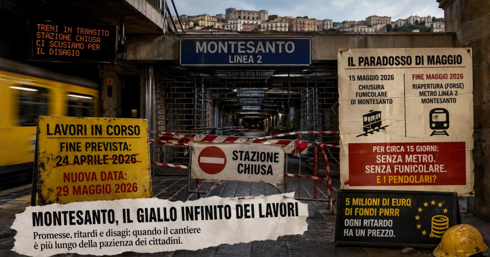 Napoli, primavera 2026. Doveva essere il simbolo della ripartenza, invece è diventato l’ennesimo capitolo della lunga saga cittadina dei “lavori in corso… ancora per poco”. Quel “poco”, però, a Montesanto sembra avere una percezione tutta partenopea del tempo. La stazione della Linea 2 resta chiusa. La data del 24 aprile, annunciata come traguardo definitivo, è già archiviata insieme alle promesse di riapertura. I treni passano, ma non si fermano, come i pendolari, costretti ad arrangiarsi.