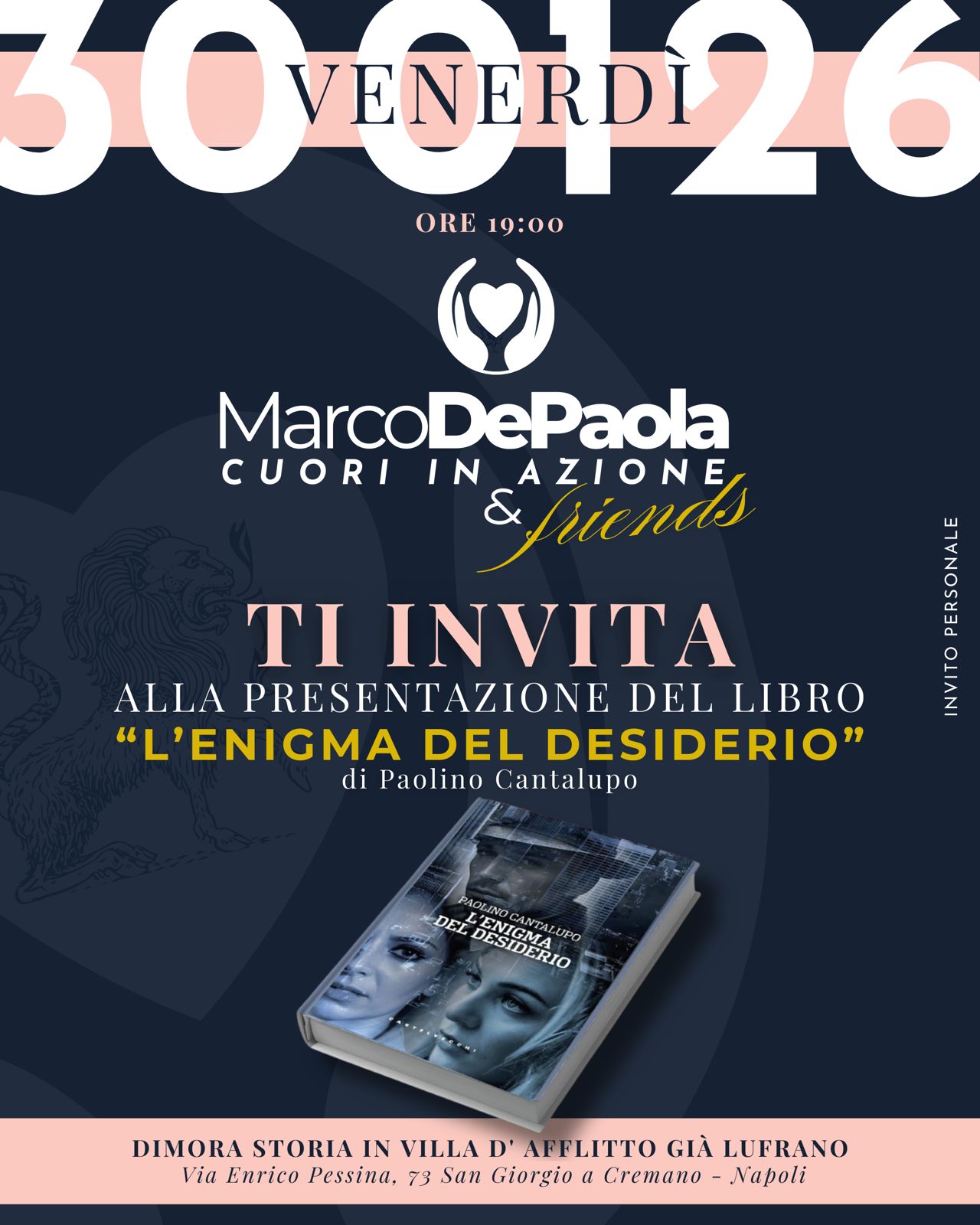 Il romanzo ‘L’enigma del desiderio’ è un thriller psicologico e geopolitico di ampio respiro. Ambientato tra New York, il Mediterraneo Orientale e l’Africa. Il libro racconta la vicenda di Adham, docente di psichiatria, costretto a confrontarsi con un passato irrisolto quando il fratello Orion viene accusato di omicidio. Nel tentativo di scagionarlo Adham viene coinvolto in una complessa rete di intrighi internazionali che comprendono gruppi armati, società finanziarie e Servizi segreti. L’Associazione Marco De Paola Cuori in Azione & Friends promuove la presentazione del libro “L’enigma del desiderio”, di Paolino Cantalupo, venerdì 30 gennaio alle ore 19.00, presso Dimora Storia, in Villa D’Afflitto già Lufrano a via Enrico Pessina 73, a San Giorgio a Cremano. La narrazione affonda le proprie radici nell’attualità geopolitica ed è costruita su elementi realistici, tratti da report giornalistici internazionali e studi strategici della Difesa. Un piano tanto geniale quanto rischioso e una travolgente passione d’amore rendono la storia intensa e ricca di tensione, fino al ritorno nella New York, simbolo delle contraddizioni della modernità. L’incontro si inserisce nel percorso di iniziative culturali promosse dall’Associazione Marco De Paola Cuori in Azione & Friends, nata da un progetto di Confdistribuzione, con l’obiettivo di valorizzare la cultura come strumento di dialogo, impegno sociale e partecipazione attiva della comunità.